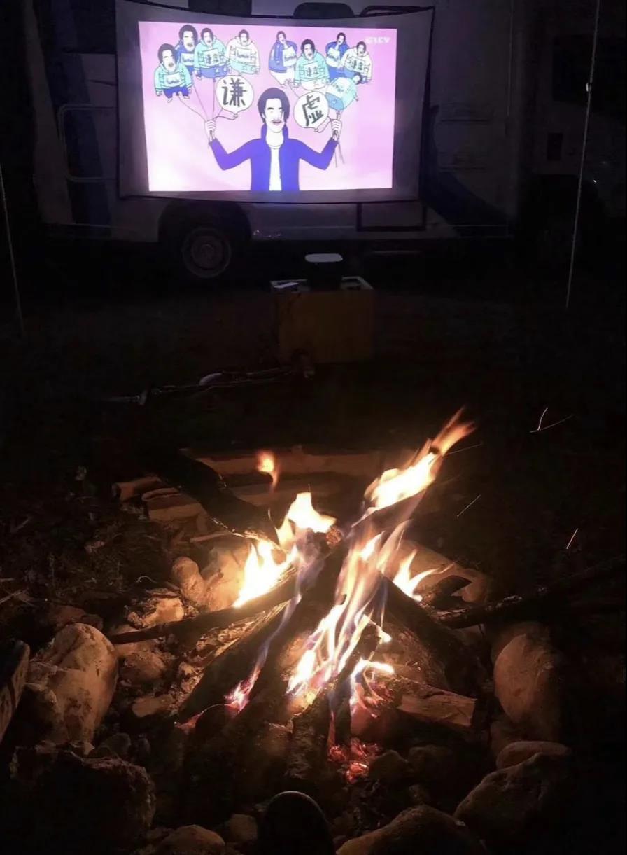 要說篝火和什么最搭配,當(dāng)然是露天電影啦!圍著篝火,找一個(gè)靠背椅,溫暖舒適,伙伴們看起露天電影來。