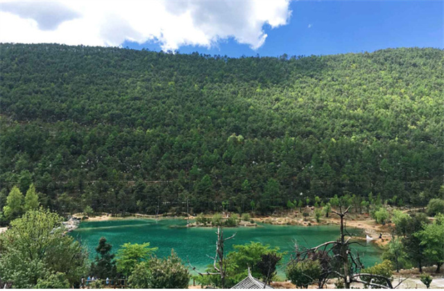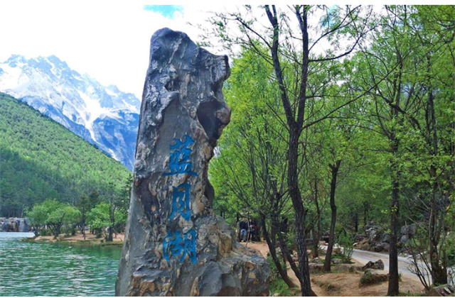 在晴天時,水的顏色是藍色的,而且山谷呈月牙形,遠看就像一輪藍色的月亮鑲嵌在玉龍雪山腳下,所以名叫藍月谷。
