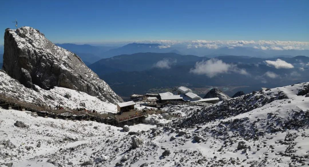 冰川公園位于海拔4506米扇子暴陡下方的冰川區(qū),沿著木制棧道上升約180米,直到的觀景平臺,這是最近距離接近玉龍雪山冰川的觀景勝地。天氣晴好,向下一眼望去,那一汪深藍,便是著名的藍月谷了。