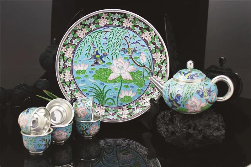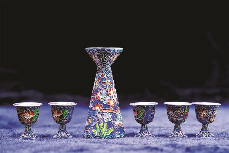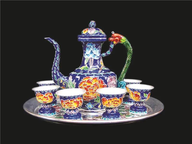 工藝流程共分為:制坯、掐絲、點藍(lán)、燒藍(lán)、檢驗、包裝六道程序,其中掐絲、點藍(lán)兩道程序最為費工。制品有茶具、餐具、首飾三個類別,如:耳環(huán)、手鐲、發(fā)簪、章盒、酒具、茶具等。紋飾多為中國漢族民間吉祥圖案,如:蝴蝶、牡丹、盤纏、綬帶和喜鵲。