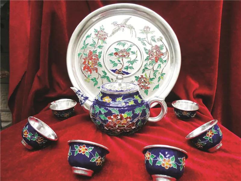 元末明初,永勝琺瑯生產(chǎn)只限于小件飾品,如婦女的手鐲、耳環(huán)、戒指、頭釵等,到了清代中期和后期,陸續(xù)發(fā)展到制作墨盒、花瓶、首飾盒、長壽鎖、佛像等。至于制作大件成套餐具則是 1917 年前后,由銀器匠人張文峰研制而成,在此基礎(chǔ)上,他還開辦工廠,招收徒弟,將銀器制作形成規(guī)模,生產(chǎn)銷售,使這項工藝得到迅猛發(fā)展。