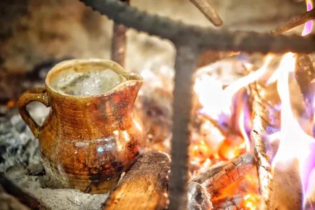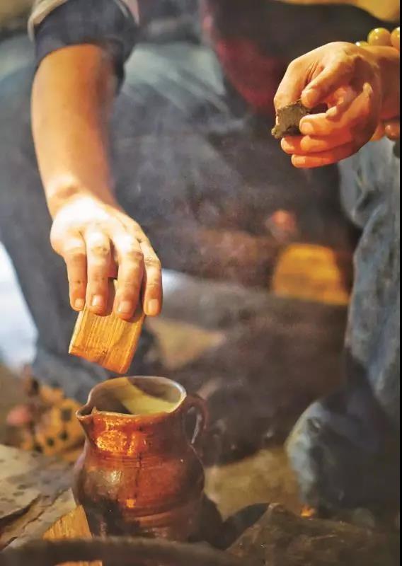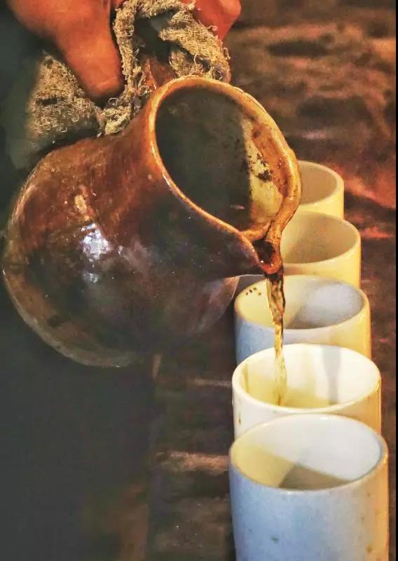 歡聲笑語間,陶罐里的茶水已經(jīng)完全沸騰開來,噗噗作響,偶爾有幾滴濺到火塘中,一股濃郁的茶香撲鼻而來。