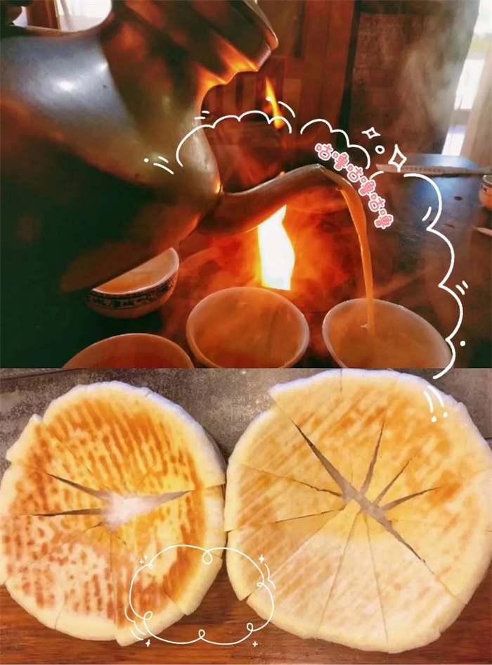酥油茶在冬天格外受麗江人的喜愛,一壺奶香四溢的酥油茶在冬天能給人帶來無限的溫暖!中午來一碗酥油茶,下午的工作精神足,配酥油茶的主食一般為麗江的火烤粑粑,可是光有兩樣東西怎么能滿足,再配上酸菜炒洋芋、納西小炒肉、虎皮青椒,這就是完美的一餐。