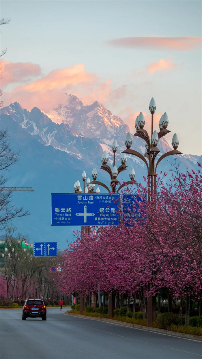 4月份正值春季,春天的麗江,萬物復蘇,雪山下的櫻花也如期而至了。每年的3-4月份,這里的街道便被一片粉紅給包圍,一朵朵盛開的櫻花在和煦的陽光下隨春風飄動著,偶有花瓣飄落在地面……
