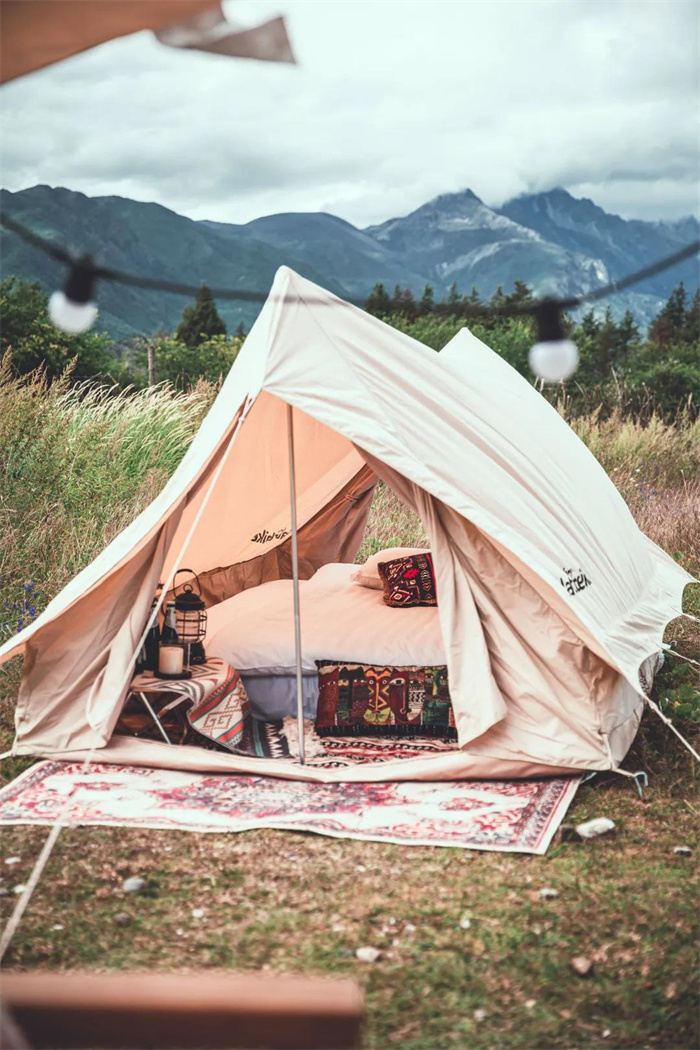 很快就到達(dá)了營(yíng)地,可以說(shuō)是到達(dá)了夢(mèng)想中的生活。在群山中藏著的一片空地,周圍一圈圈狗尾草,幾頂帳篷放置其間。在草地上鋪一塊毯子,往上一坐就是舒適愜意的田園隱居生活。