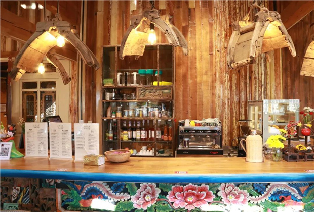 店內(nèi)的裝修是簡單大氣的木質(zhì)風(fēng),但又不失細節(jié),一個燈罩可能是酥油罐的蓋子,墻上是裝飾是一扇扇的木窗拼接在一起。