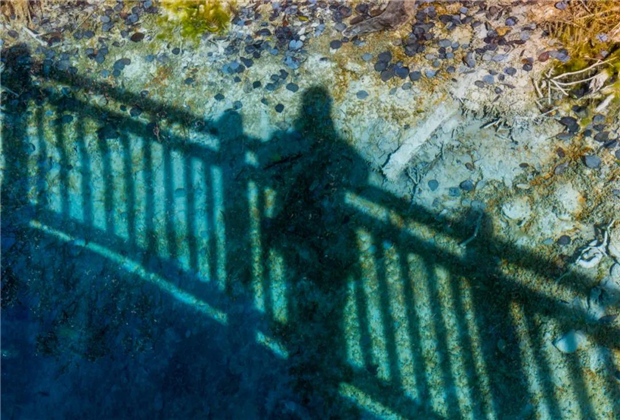 迎著山風(fēng),漫步在棧道上,兩邊的湖水波光粼粼,純正的“蒂芙尼藍(lán)”讓你忍不住想拾一方嵌在胸前。