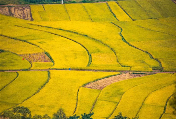 周圍的稻田漸漸變黃,瓜果蔬菜慢慢成熟,黃綠相間的梯田圍繞著水波不興的湖水,簡(jiǎn)直賞心悅目。