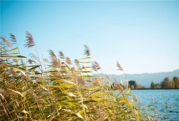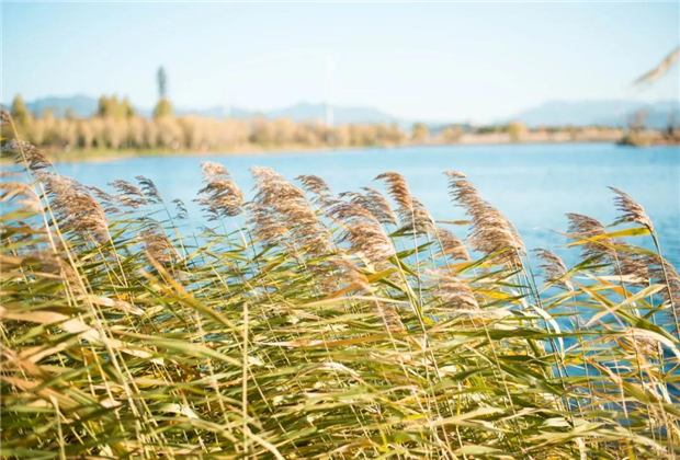 湖中的小島上、湖四周,處處都長滿了蘆葦,為冬日里甚是平靜的湖面增添了不少色彩。