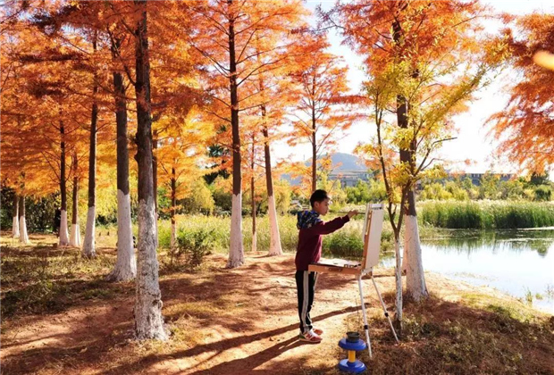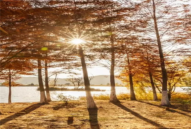 站在這秋天的杉葉林里,陽光下,能感受的只有溫暖明媚,看到的只有高遠藍天上的白云悠悠和紅杉如火。