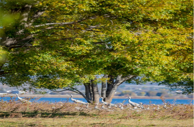 而通過(guò)望遠(yuǎn)鏡或長(zhǎng)焦鏡頭望向更遠(yuǎn)處的小洲,一大群灰鶴正歇息于此,恍若伊人在水一方。盡管還有一定的距離,但小V依然不敢高聲語(yǔ),恐怕驚到這群膽小的仙子。