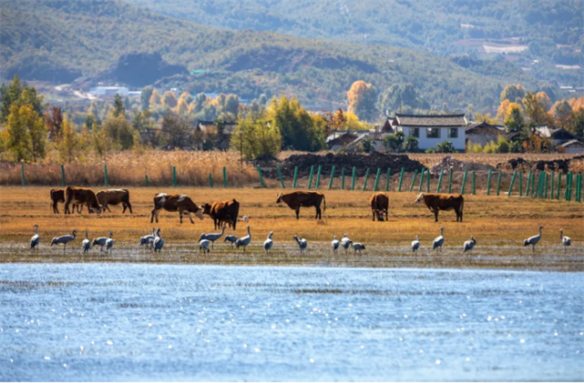 回到拉市海管護(hù)局,門前的濕地邊也有一群灰鶴。它們?cè)谒呉蛔峙砰_(kāi),與身邊的老牛若即若離,互不干擾,和睦相處,真是一幅和諧優(yōu)美的田園畫卷。