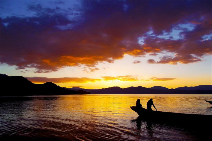 在瀘沽湖環(huán)湖一周,總有一個角度可以使你留戀。里格半島的心形灣,達祖碼頭的日出,女神灣的水波倒影,走婚橋的萬畝草?!巫咴跒o沽湖邊,微風吹拂,碧波蕩漾,讓人在動態(tài)中感受到她的生命與張力。坐豬槽船看清晨日出,朝霞把天空映的金黃,紅日初升,彩云倒映其中,泛舟其上,仿佛是在仙境里遨游。走在摩梭人的走婚橋上,看草海隨風飄搖,水路錯綜,紅衣白裙的摩梭姑娘劃著船出沒其中,悠揚的民歌在草海中回蕩,如同一幅斑斕的油畫,讓人沉醉其中。