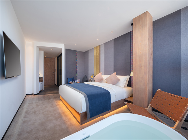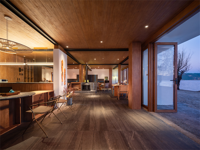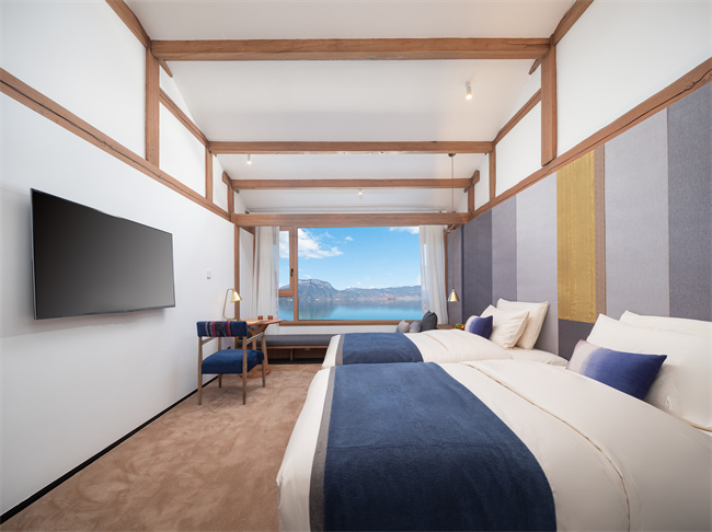 跟著麗江小眾民宿,瀘沽湖小眾民宿,瀘沽湖高端民宿,瀘沽湖野奢民宿,瀘沽湖湖景民宿,瀘沽湖設計師酒店小編一起來看看吧!匠廬悠藍,位于山湖彼端的摩梭小屋,它像極了盧梭筆下的“瓦爾登湖”秘境。民宿以當?shù)啬λ笕藗鹘y(tǒng)木屋為靈感,將民族特色與現(xiàn)代極簡很好的運用在室內(nèi)外的設計裝修上,外墻選用當?shù)氐睦狭耗尽⒑煌龄佋O而成,散發(fā)著質(zhì)樸的氣息。遠遠看過去,像漂浮在瀘沽湖面上的摩梭人家。設計師對空間流線的推敲和留白,將書吧、接待區(qū)、餐廳巧妙分開,而長廊兩側(cè)的水景和端頭的秋千讓房屋與湖景的關系更顯得靈動有趣。房間內(nèi)的擺設、用品講究,注重收納,每間房的窗開得很大,一轉(zhuǎn)眼就是遠處的青山白云和優(yōu)美的湖景。一樓的公區(qū)都是落地門,均可打開通向瀘沽湖岸邊。在這里,住客可以坐在吧臺點一杯飲品和店里的管家親切交談,也可以隨時走向湖邊喂海鷗。2021年開業(yè),總共有12間房。