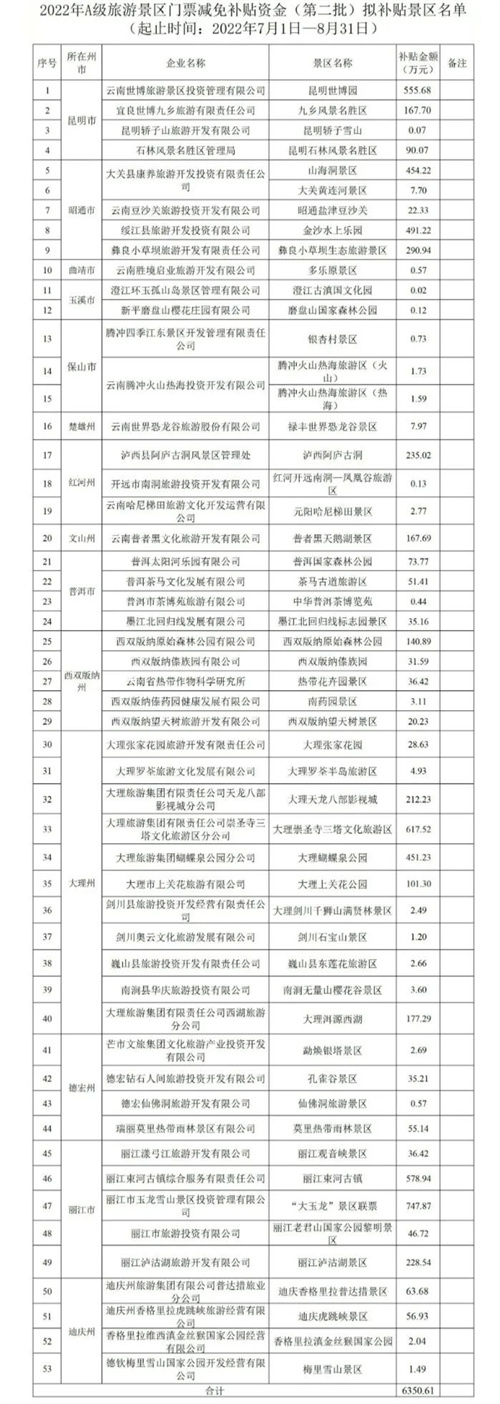 擬獲第二批補貼的53家景區(qū)來自昆明、大理、麗江、西雙版納等14個州市,從單家景區(qū)來看,“大玉龍”景區(qū)聯(lián)票擬獲補貼金額最高,達到747.87萬元,麗江束河古鎮(zhèn)排名第三位,擬獲補貼578.94萬元。