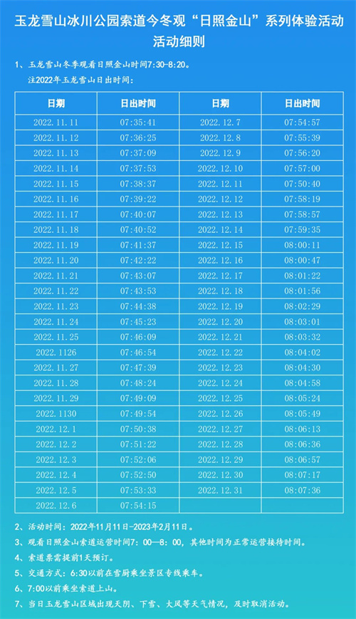 麗江旅游包車:11.11起,玉龍雪山冰川公園索道正式推出今冬觀“日照金山”系列體驗活動