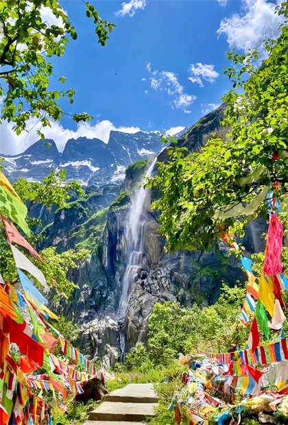雨崩神瀑是梅里雪山融水形成的壯麗瀑布。在藏族文化中,人們將到雨崩神瀑下沐浴視為凈化心靈的修行方式,