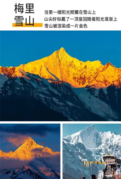 女峰和五冠峰,近距離瞻仰梅里雪山的神跡。每當(dāng)日出日落時(shí)分芒與山峰的雪白