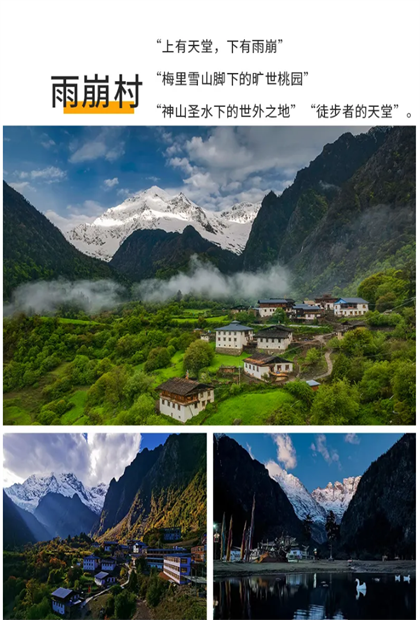 下有雨崩”“梅里雪山腳下的曠世桃園”“神山圣水下的世外之地”“徒步者的天堂”。