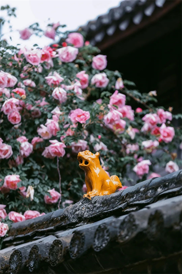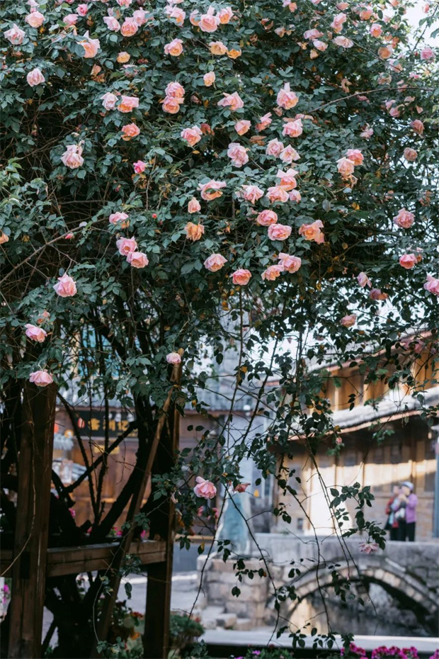 “麗江之路”的美,不僅在于它的花朵,更在于它與麗江古城的相得益彰。在古城的很多角落,你都能找到它的身影。它