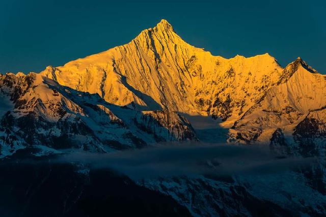 最高峰卡瓦格博峰海拔高度為6740米,是云南省最高的山峰,位于德欽縣西南方10千米處,距中甸縣城184千米。長約30公里,其中呈金字塔狀的最高峰為卡瓦格博峰,海拔6740米,為突出于周圍群山山頂面近千米的極高山,是云南省的最高峰。梅里雪山斷裂活動強烈地勢高聳,有13座海拔6000米以上高峰在卡瓦格博峰周邊環(huán)繞,是青藏高原東南緣最高山。