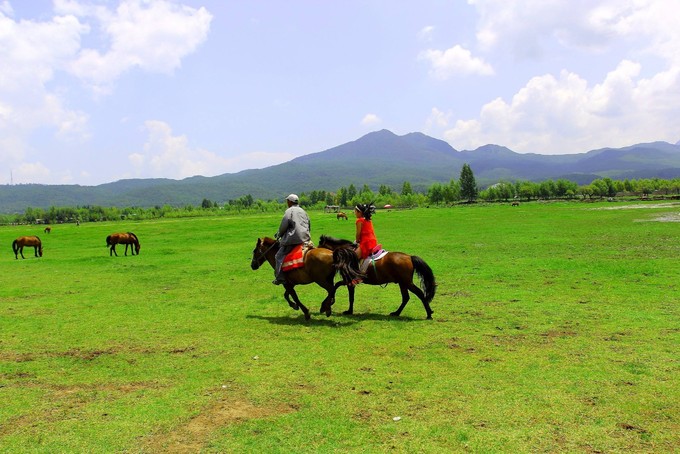3、 騎馬 拉市海馬場(chǎng)的線路繁多,最主要的有兩條線:一條是觀景環(huán)湖路線,囊括本季節(jié)最豐富多彩的景點(diǎn)路線,比較適合不怎么會(huì)騎馬的客人,客人可以一邊慢慢掌握騎馬技巧,一邊游山玩水;另一條是跑馬自助路線,比較適合已經(jīng)會(huì)騎馬的客人。