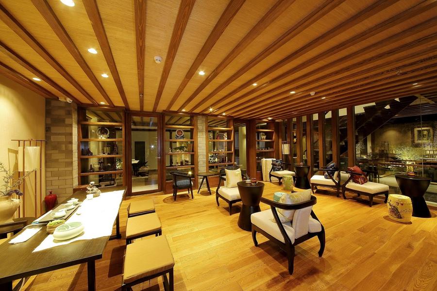 ●穿過花叢,順著那道精致的水墻,繞過水路,進(jìn)入了酒店大門。全木質(zhì)結(jié)構(gòu)的背景墻,古香古色的大廳,既落落大方又富有創(chuàng)意,瞬間讓人眼前一亮。進(jìn)門右手邊是前臺(tái),前臺(tái)人員均穿著納西服裝,將納西文化生動(dòng)的表現(xiàn)出來。進(jìn)門正前方就是休息室和茶室,在等待辦理入住手續(xù)的過程中,茶藝師為我們沏了一壺上等的云南普洱茶。