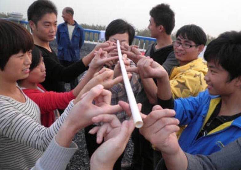 2、在保證每個(gè)人的手都在輕質(zhì)塑料棍下面的情況下將輕質(zhì)塑料棍完全水平的往下移動(dòng)。一旦有人的手離開輕質(zhì)塑料棍或輕質(zhì)塑料棍沒有水平往下移動(dòng),任務(wù)就算失敗。