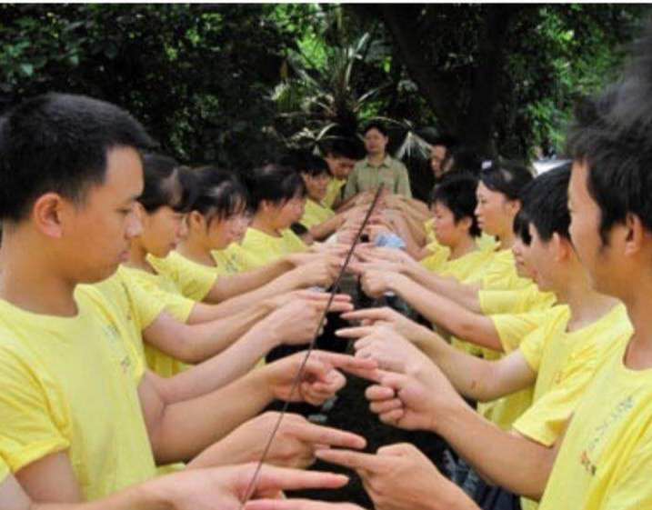 3、在兩列之間放上細(xì)直棍,所有參與者用食指在下面托起直棍,然后緩慢下降,最終將直棍放在地上;
