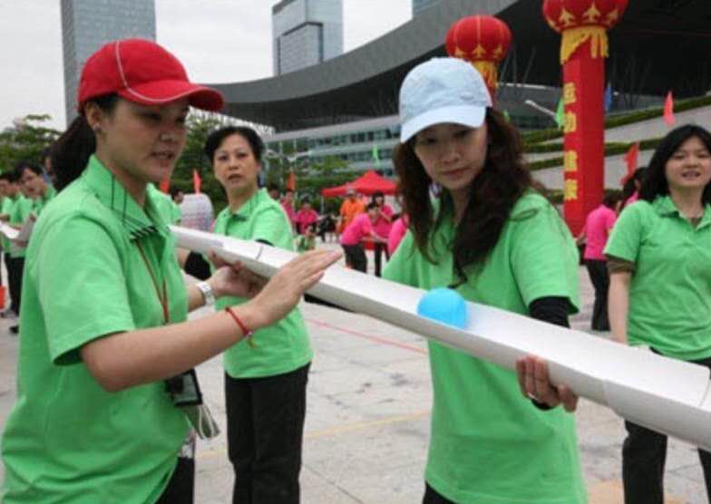 9、如果是10到30人,所有人圍成一個圓圈,每人手拿球槽,然后讓球在球槽中滾動傳遞,在球不掉落的情況下傳遞5圈則為成功。