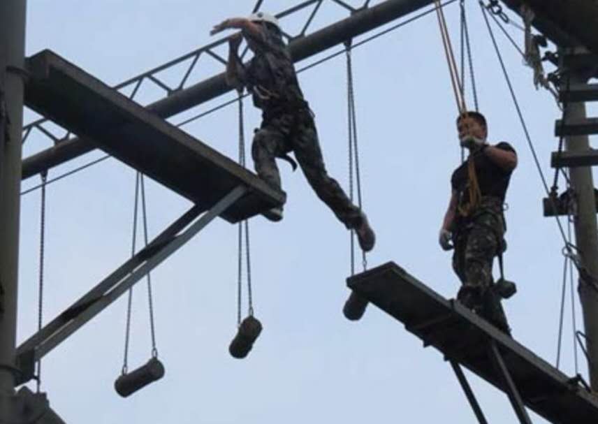 2、學(xué)員在周全保護下依次獨立爬上約8米高的斷橋,獨立完成跨越斷橋的任務(wù)。