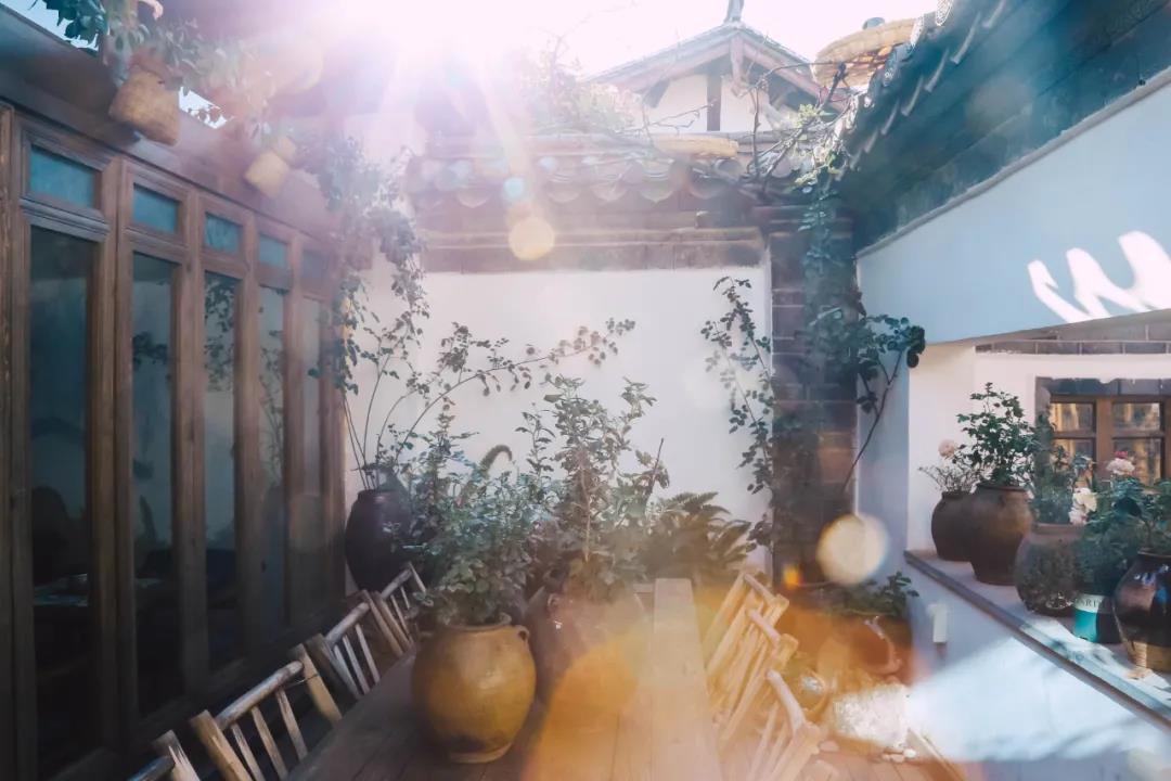 這時候的天空就像被一瓶打翻的藍(lán)墨水暈染開來一般,碧空如洗,天高云淡,眺望遠(yuǎn)方時,還可以看見高聳入云的玉龍雪山。