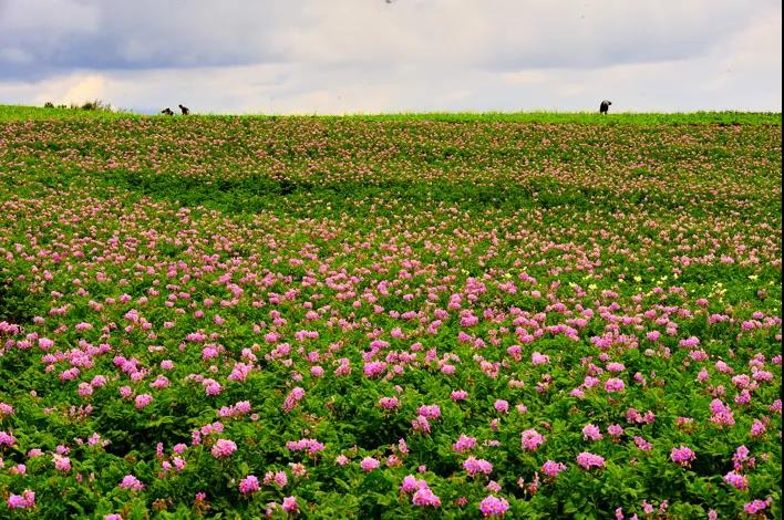 太安的洋芋花分別是:白色、粉色、紫色,3個(gè)不同的色彩,一朵朵的小花,就像一個(gè)情竇初開的少女,羞澀惹人愛(ài)。哈哈,雖然你吃過(guò)土豆,但是你有見(jiàn)過(guò)如此大片三色彩的花海嗎?一行人漫步在色彩斑斕的三色世界,走在花間小道,隨處可見(jiàn)的游客,在田間嬉戲拍照,輕輕撫摸花枝,俯下身細(xì)聞洋芋花粉的獨(dú)特味道,香氣撲鼻。站在小山峰俯瞰整個(gè)的洋芋花海,藍(lán)天白云的天,和五顏六色的花海。花和天空,兩種鮮明的顏色,搭配在一起,讓眼前的景變成了一張美麗的明信片。