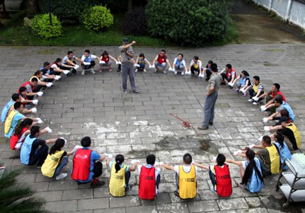 動(dòng)力繩圈別稱(chēng)動(dòng)力圈、動(dòng)力繩、合力圈,本項(xiàng)目要求所有人手拉手圍成一圈,松開(kāi)手,每人握住繩子的一部分圍成一個(gè)圓,雙腳合并,用腳后跟著地,所有人同時(shí)向后倒,讓團(tuán)隊(duì)成員依次在這個(gè)繩子上走一圈。在走完這一圈的過(guò)程中是不能掉下來(lái)的,否則需要重新開(kāi)始。也可讓各團(tuán)隊(duì)各自組隊(duì),每隊(duì)輪流進(jìn)行PK